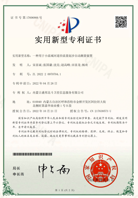 2022年11月30日,盛邦北斗获得国家知识产权局授予的四项实用新型专利,分别为“一种用于小流域河道径流量泥沙自动测量装置”、“一种用于水文监测的水位变化监测装置”、“一种低温数据采集装置加热模块”、“预防地质灾害的远程全自动雨量监测装置”。